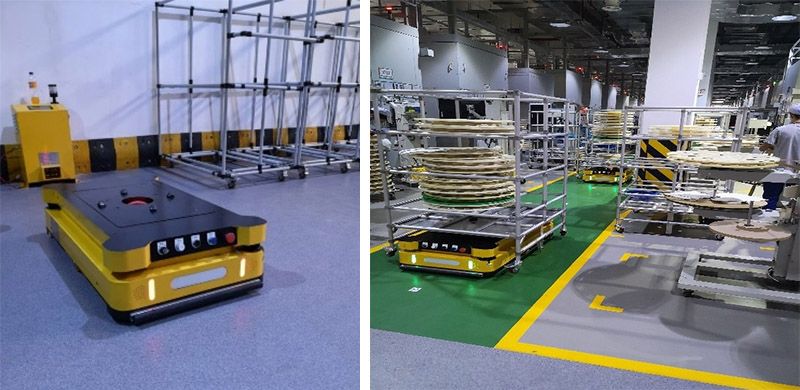基于豐富的項目經驗,結合現場場景需求,引入包括2臺L06 AGV車、17臺iPad、70臺物料車、1套充電樁、1套調度系統和1套WMS系統的完整解決方案,打造了模板生產全自動車間,由人工生產階梯式跨越實現自動化、信息化。