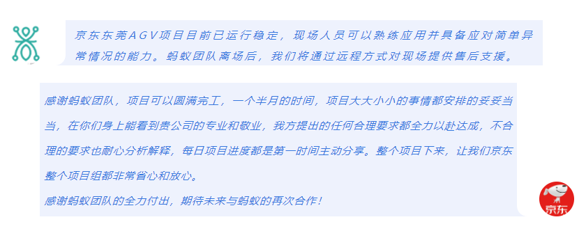 從售前方案制作到項(xiàng)目交付,螞蟻機(jī)器人一直兢兢業(yè)業(yè),用專(zhuān)業(yè)和敬業(yè)為項(xiàng)目畫(huà)上一個(gè)完美的句號(hào),并得到了客戶(hù)的一致點(diǎn)贊。螞蟻機(jī)器人為京東量身打造的柔性物流解決方案,顯著提升了改造倉(cāng)的物流服務(wù)質(zhì)量,助力京東物流創(chuàng)造更大的價(jià)值。