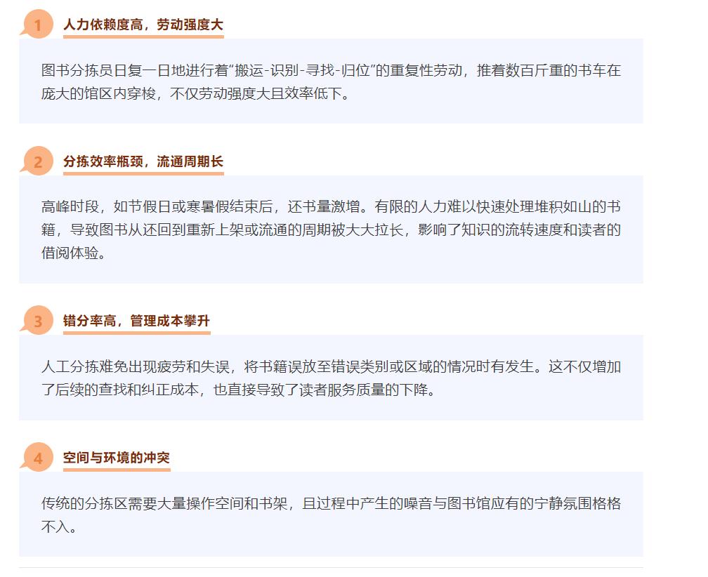 在引入螞蟻機器人智能分揀解決方案之前,傳統的圖書館運營普遍存在以下嚴峻挑戰: