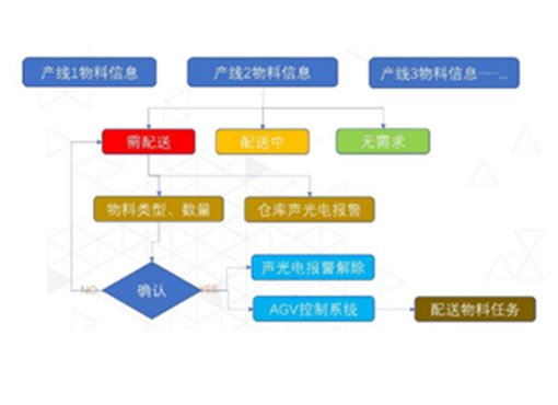 4、實時顯示各產線物料需求狀態,觸發配送需求的產線亮紅燈,配送中亮黃燈,無需求亮綠燈。